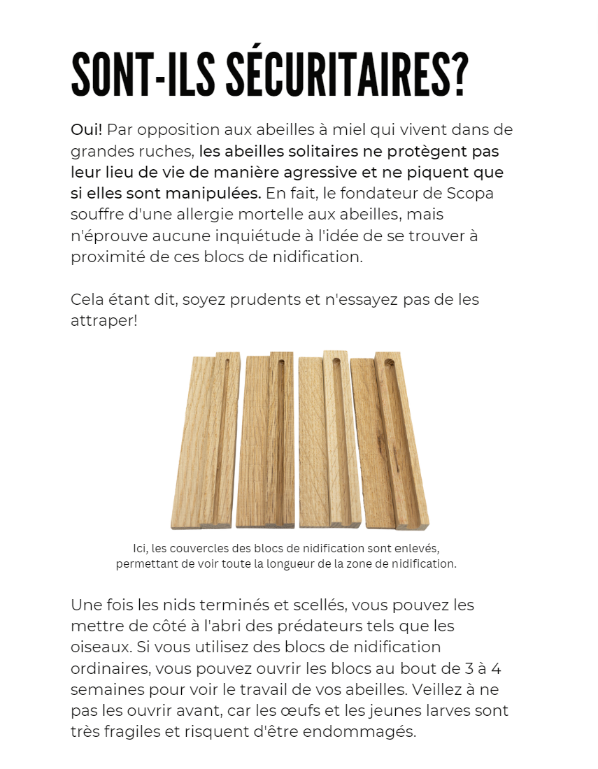 En facilitant l'enlèvement et le placement de chaque bloc dans un endroit sûr après la fermeture du nid, vous pouvez réduire le temps d'exposition et augmenter les chances que les jeunes abeilles atteignent l'âge adulte.