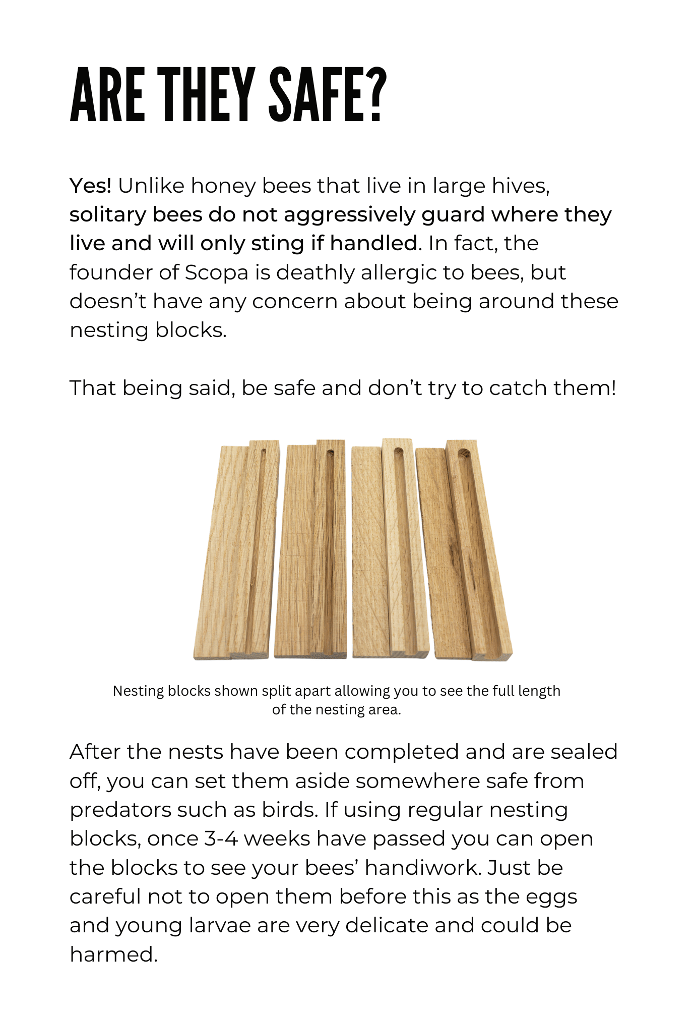 To toot our own horn, the bee blocks we make at Scopa - which are based off entomologist Karl Krombein's design from the late 1960s - do not have the shortcomings mentioned above. Our blocks also come with the benefit of being able to remove them individually to protect them from predators and other animals that don't have the bees' best interests at heart, which increases the odds that the young make it to the following year. And since they're made of white oak, you can reuse them for many years, and give them right back to nature when they're at the end of their life.